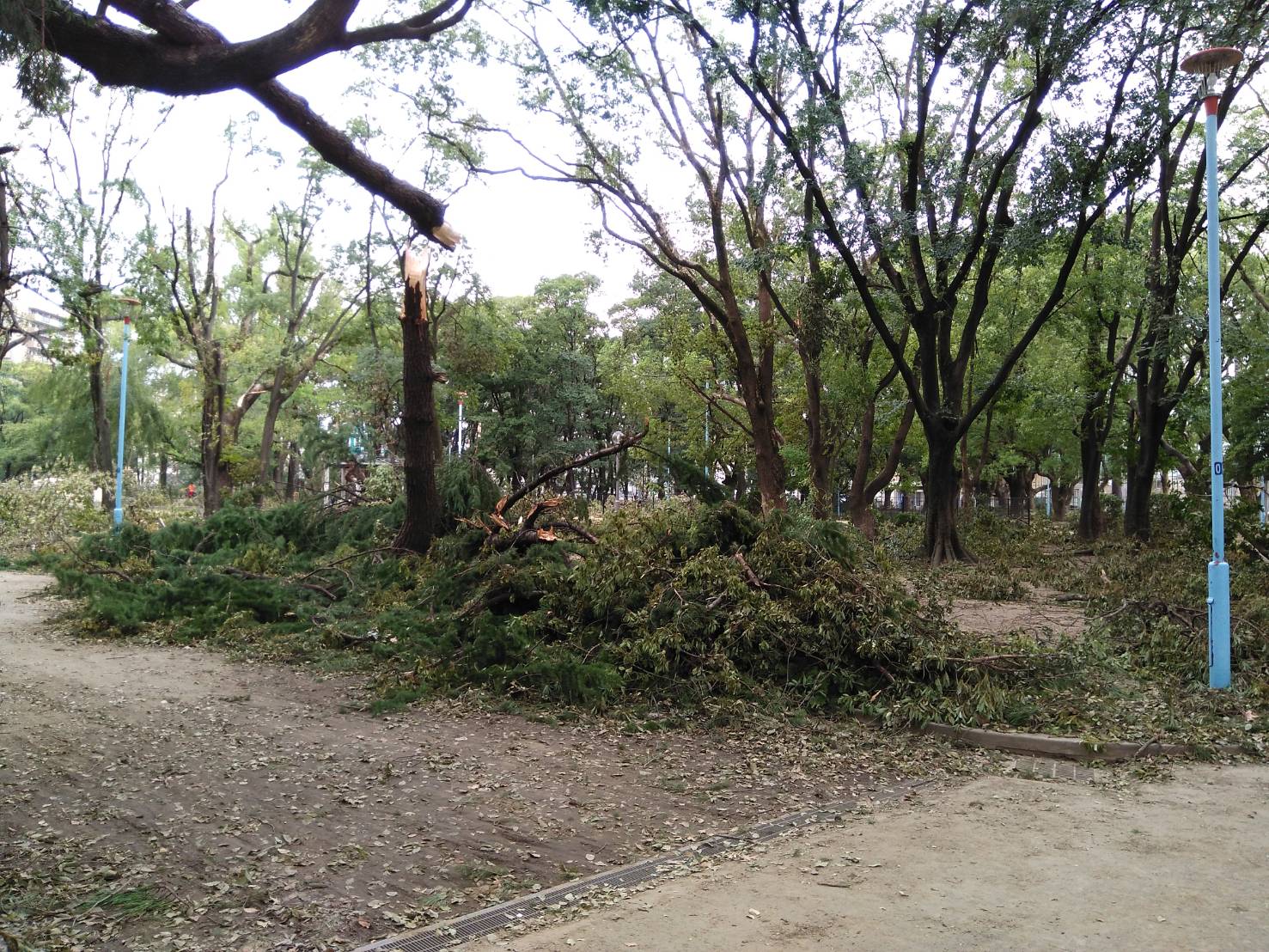 こんばんは。近くの公園の木が折れていたそうです。娘が写してくれました。知り合いの方の家の屋根も飛んでしまったようで家財は水浸しになったそうですが、修理は予約でいっぱいで、いつになるかわからないそうです。店先のテントが曲がったり、シャッターがこわれていたりするお店もあります。