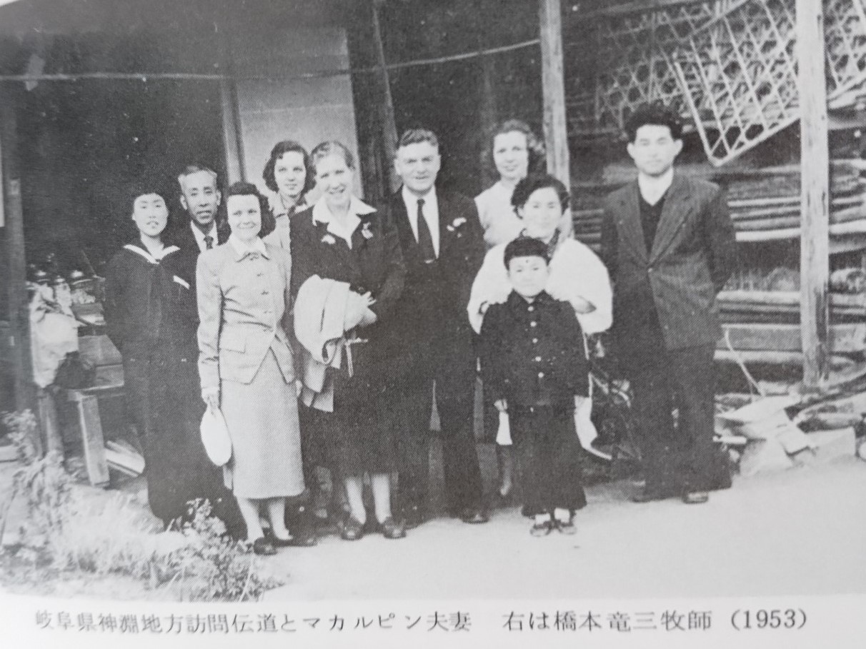 当時岐阜県には、中央線に筆者と大垣教会に杉山豊胤教師、岐阜加納教会に伊達量平教師、岐阜市に浅倉重雄教師と飛騨高山に同盟教会の教職が一両名と言った状況で、戦火のために岐阜加納、大垣地方は会堂を失っていた。従って、集会することはとても不可能で、多く山地の中央沿線に、先ず強力な伝道が集中してなされ、マカルピン氏は毎月、箱型のステーションワゴンで悪路の山坂の険しい峠を越えて伝道を続けた。