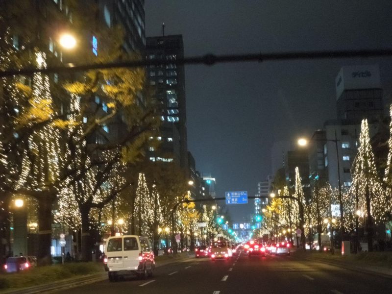 夕方から、雨がやんだので主人に、御堂筋イルミネーションを写しに連れていってもらいました。あまり、きれいには写せませんでしたが車の中で写せるのは感謝です。