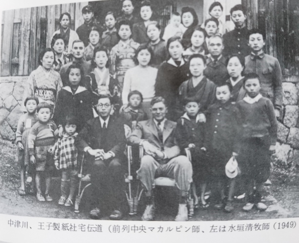 中津川、王子製紙社宅伝道(前列中央マカルピン師、左は水垣清牧師(1949)