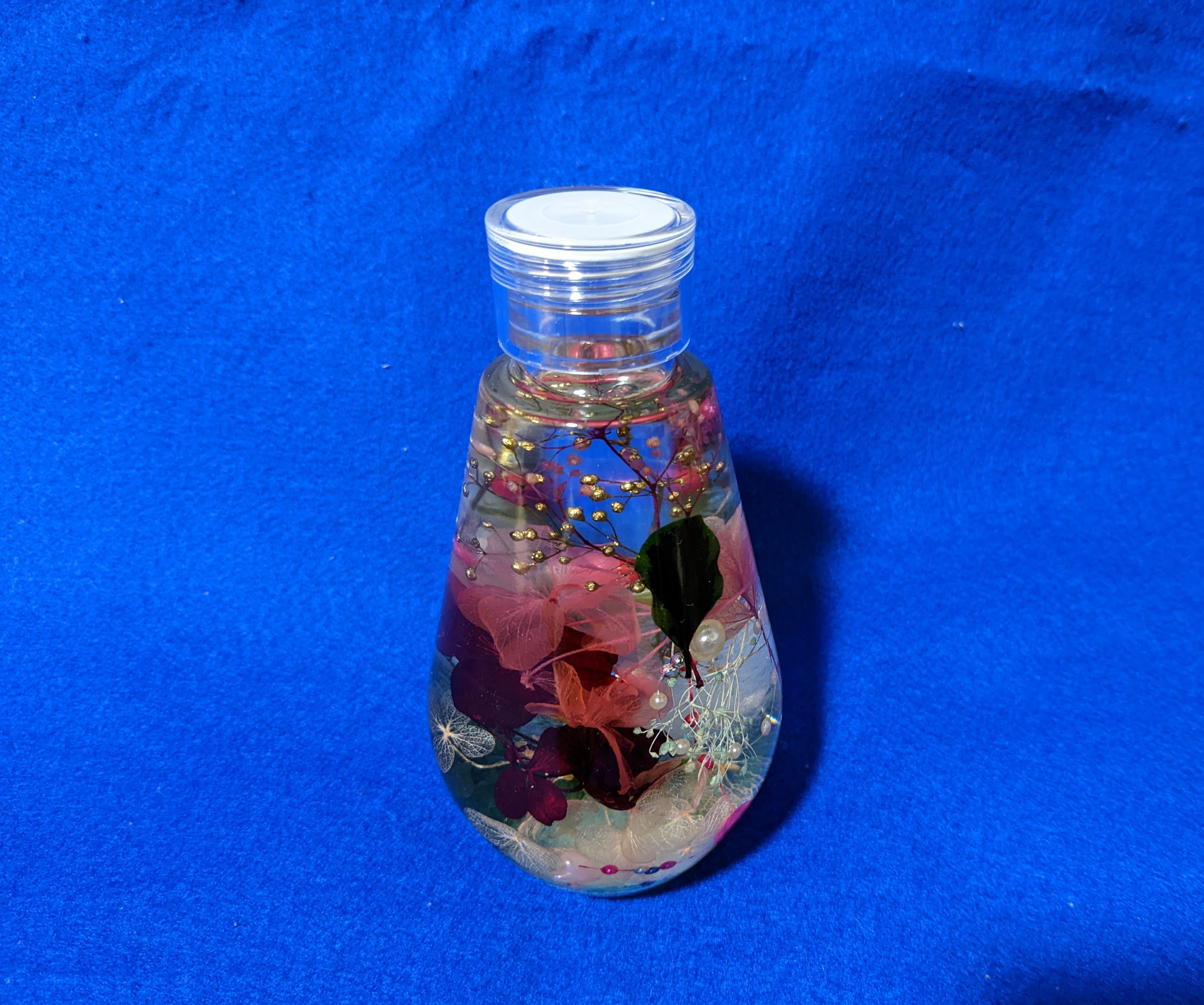 ☆ もう1つ、リハビリに役立ったものがあります。ハーバリウムというもので、ボールペンの中にオイルと花などを入れて作ります。ピンセットで、小さな花を中に入れるのですが、最初は指が麻痺していて1つも入れられませんでした。指のリハビリは、お箸で豆を挟むくらいで楽しくなくて続かないですが、落としても、まわりが花だらけでしたが、幸せに、そして、麻痺はなくなりました。瓶に花を入れた作品です。今はなんとか元気に冬を迎えようとしています。